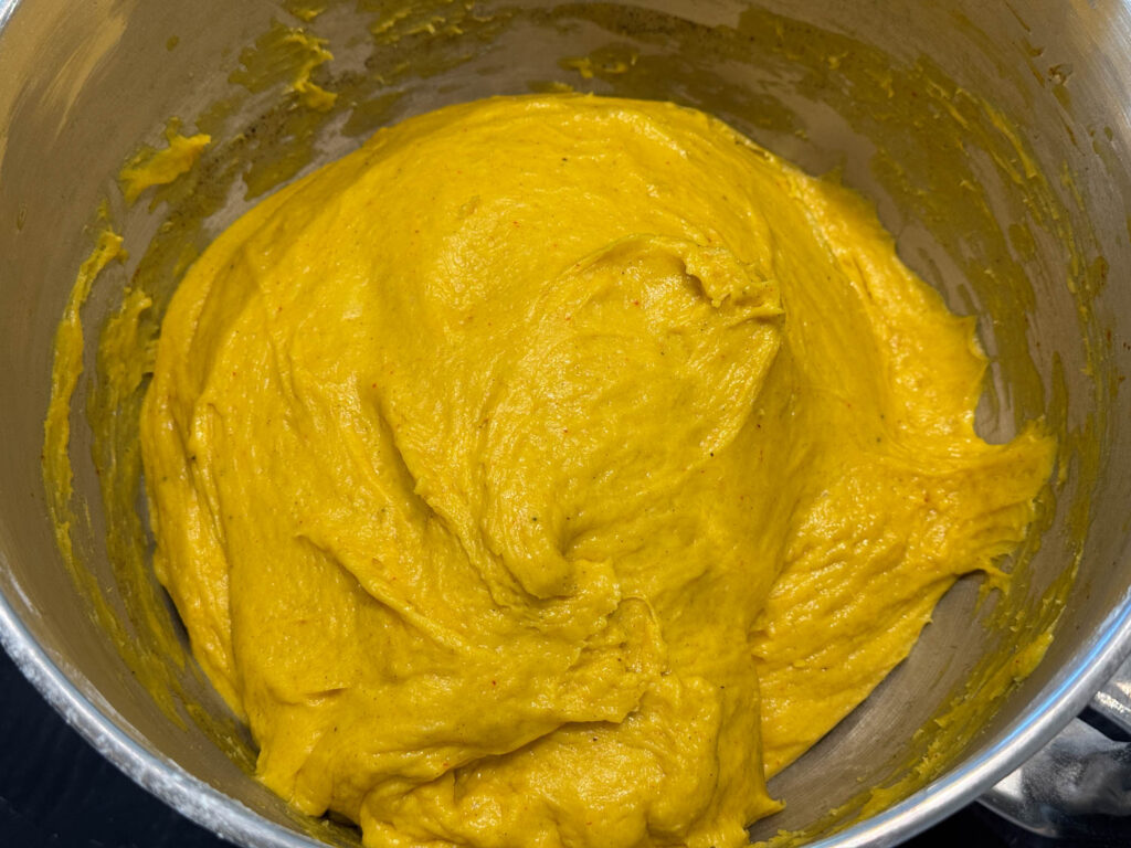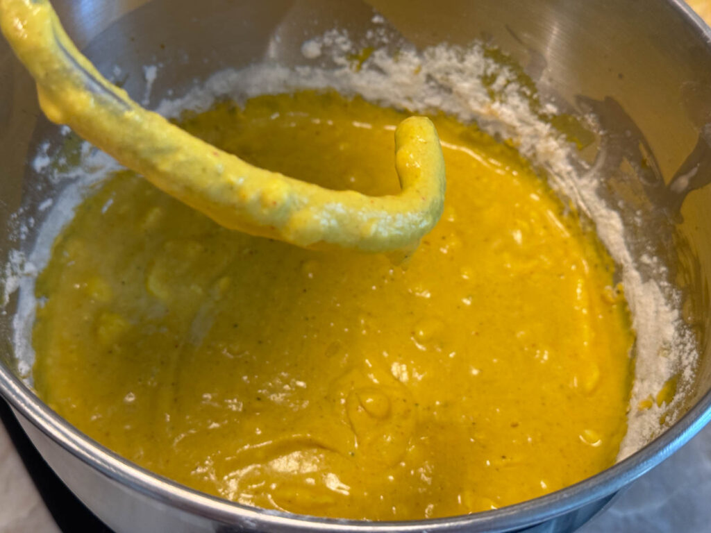 - Häll i hälften av vetemjölet och blanda ihop till en deg. Jag brukar använda en bakmaskin.