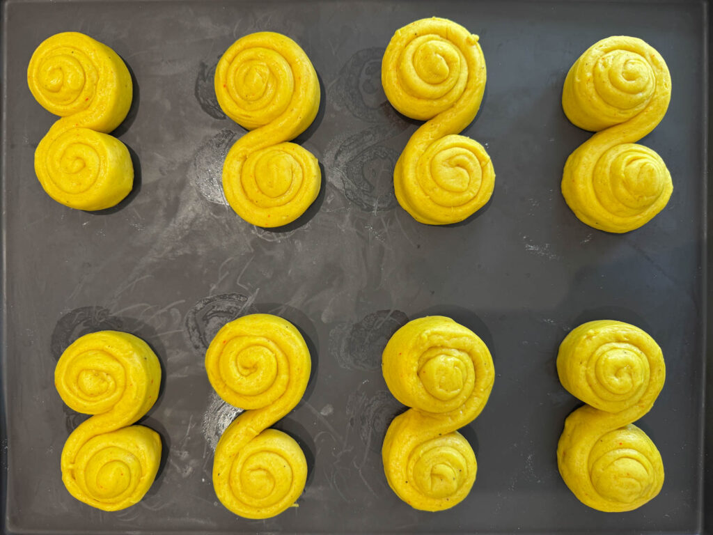 - Dela degen i 30 lika stora bitar och forma till lussebullar (tips finns längre ner i receptet på hur du gör dem extra snygga).