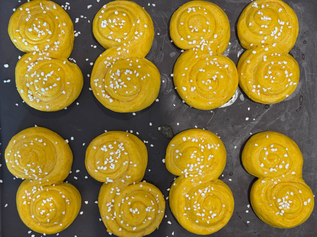 - Pensla bullarna med äggblandningen och strö över pärlsocker om du vill ha det på några av lussebullarna.