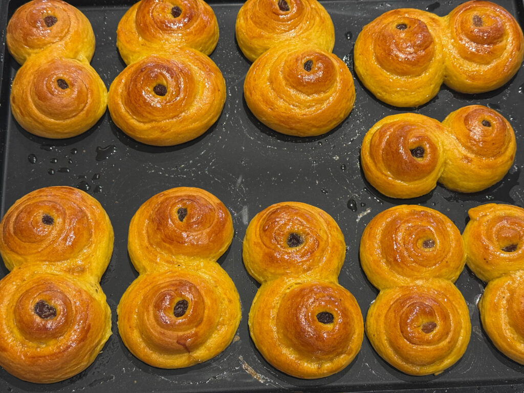 Att pensla lussebullarna med sockerlag efter de gräddats i ugnen är en smaksak. Personligen så gillar jag det då det gör lussebullarna saftigare.