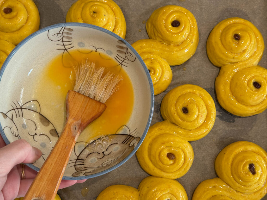 10. Pensla bullarna med äggblandningen och strö över pärlsocker om du vill ha det på några av lussebullarna.