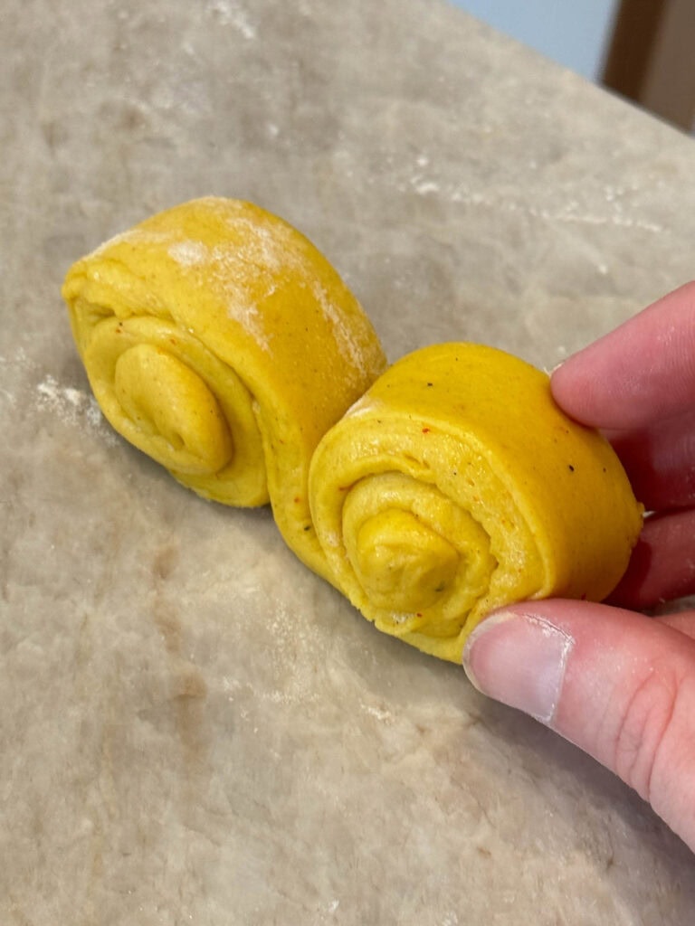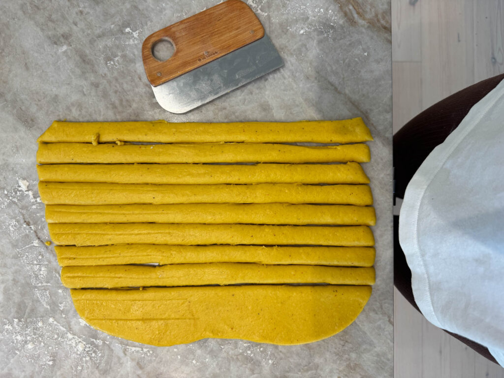 - Kavla ut degen till en stor rektangel och skär i remsor. Skär gärna med en pizzaskärare om du har en för att få till så jämna remsor som möjligt. Men det går såklart också med en kniv eller något annat vasst föremål som du kan skära med. Jag använde mig av en degskrapa och det funkade också bra.
